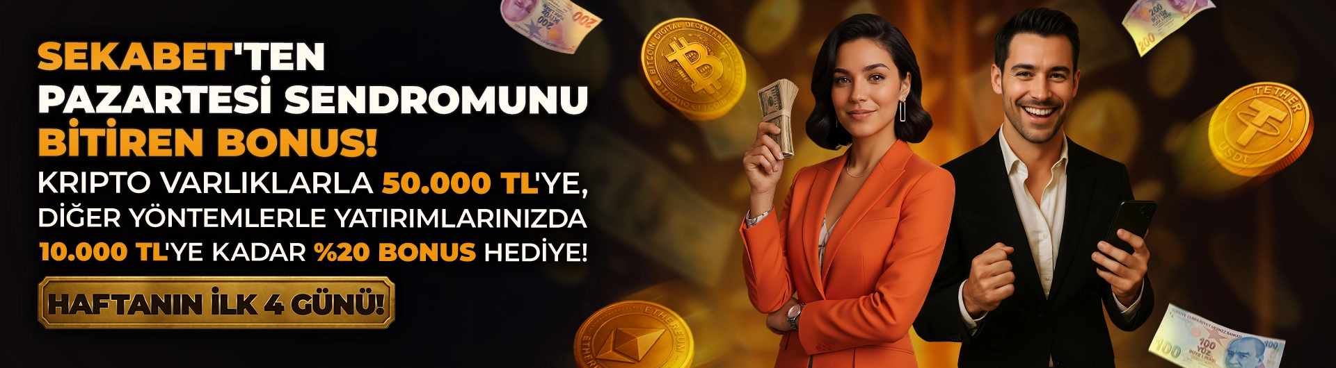 Haftanın ilk 4 günü kripto yöntemi ile yapacağınız yatırımlara 50.000 TL, diğer yöntemlerle yapacağınız yatırımlara 10.000 TL'ye kadar bonus fırsatı sizi bekliyor!